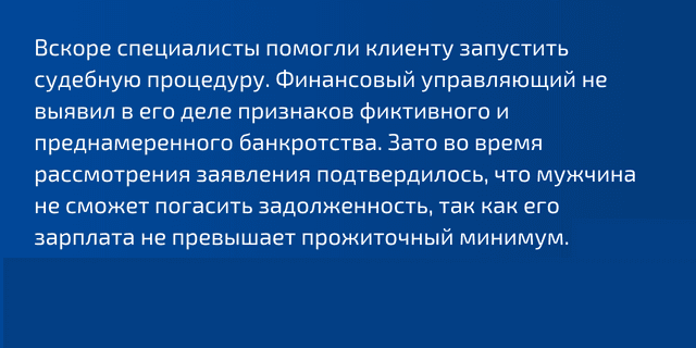 Специалисты ЮК «Заря» помогли мужчине подготовить и подать заявление. Сначала в отношении клиента ввели процедуру реструктуризации задолженности. Но мужчина утверждал, что не потянет даже более лояльный график выплат.